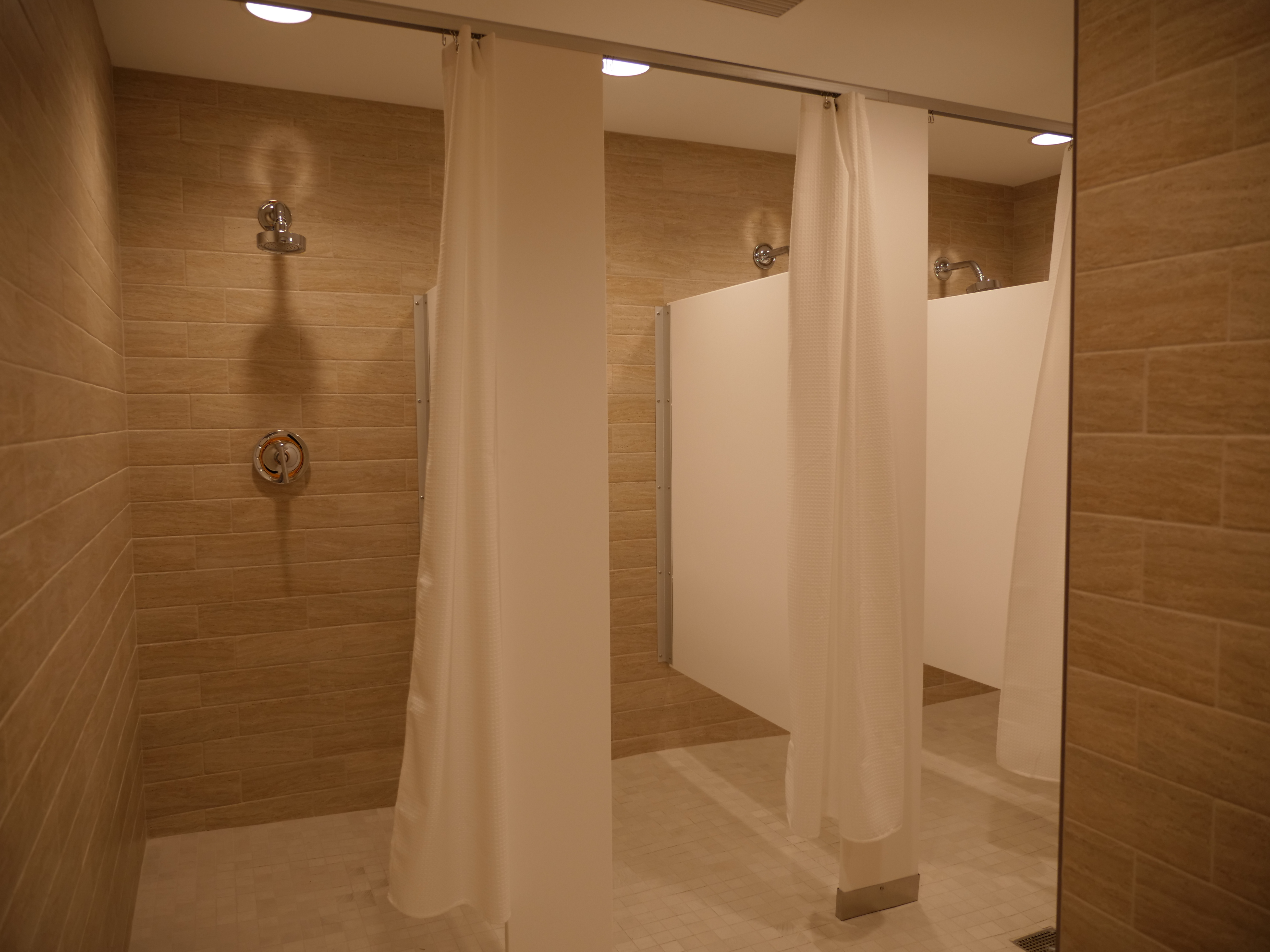 Private shower stalls with complimentary soap/shampoo